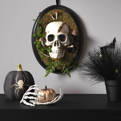 Add a classic, creepy touch to your Halloween decor with the Hanging Framed Skull Halloween Decorative Prop from Hyde and EEK! Boutique™. This cool decoration features a white skull with faux moss, plants and small mushrooms in a round black frame. Plus, it comes with a hanging loop that makes it easy to hang from a hook or peg on any wall.