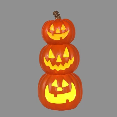 Add a glowing stack of pumpkins to your seasonal decor with the Lit Triple-Stacked Pumpkin Halloween Decorative Prop from Hyde and EEK! Boutique™. This decorative prop showcases varying-sized jack-o’-lanterns stacked atop one another for a festive look. Plus, it features a timer to allow you to customize the lighting time. Great for both indoor and sheltered outdoor use, this light-up decorative prop requires 3 LR44 alkaline batteries for operation.