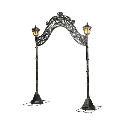 Here is the perfect entrance to your next Halloween haunted graveyard scene! Our Halloween Manor Archway Decoration sets a macabre mood with two tall lanterns that glow with a yellow flicking LED light on the tall support posts. They are connected by a decorative Halloween Manor Arch with gothic-looking scrollwork that you might see in a cemetery! The design gives the look of old ironwork in a black distressed finish. The wide sturdy bases give stability to the archway. brbr• Size: 97″ x 74″br• Material: High-density plastic with a metal base.br• Requires 6 AA Batteries, not included.br• Recommended for outdoor/indoor use.br• Simple set up is required. Complete instructions are included.