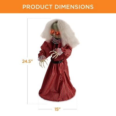 - ANIMATRONIC ROAMING DOLL: Pivoting wheels allow Holly to glide from room to room, pursuing your guests as they struggle to escape your house of horrors