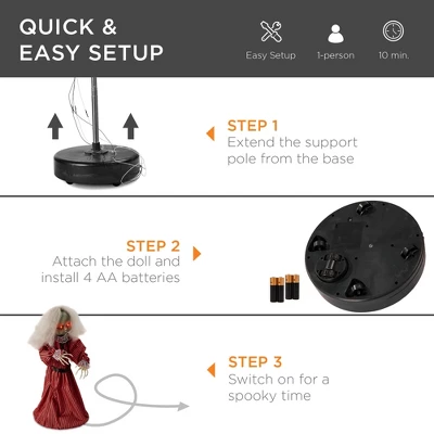 The season of scares is here! From the burned-out mansion Haunted Holly has come to play with adjustable arms and a motorized base for a terrifying chase. This doll stands on her own with adjustable arms for different spooky poses. Stand back and watch as Holly terrifies your guests with sound & touch-activated features. The high-quality design provides unforgettable scares includes glowing eyes, synthetic hair, and comes with a set of spooky phrases. Imagine hearing: “Mommy, mommy!”, “Mommy, I can’t find you”, “Mommy, I can’t hear you”, and “Oooooh Aaaaah!” But don’t forget, the best thing about Holly is her easy assembly: Step 1 Extend the support pole from the base, Step 2 Attach the doll and install 4 AA batteries, Step 3 Select control-type and enjoy! Make Halloween a season of screams today!
