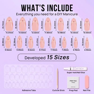 You’ll love these nails so much! The Aurora from its powder makes your nails look longer and more beautiful, giving them a natural beauty. The application process is super easy and can be done within a few minutes!Shape: almondMaterial: soft gelQuantity: 30 nail tips, 15 sizesLength: MediumIncludes:30*fake nails, 1*2G glue, 1*mini nail file, 1*cuticle stick, 30*jelly glue, 1*clean pad, 1*manual