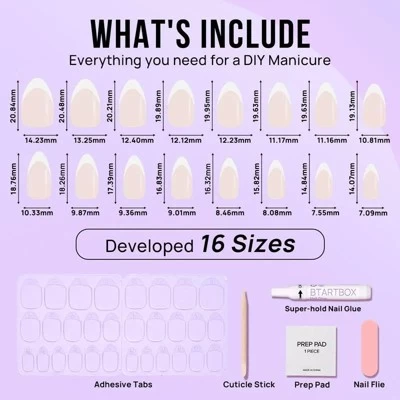 - Shape & Size: Short Almond, 32 pcs nail tips in 16 sizes