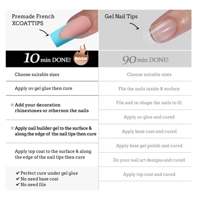 - PATENTED X-COAT™ PROCESS: Specially formulated to allow full UV penetration through the tip, ensuring complete curing with gel glue—even under French, ombre, or cat eye designs.
