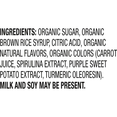 - Charms Organic Pops only contain color additives comprised of natural ingredients including Carrot, Spirulina, Purple Sweet Potato and Turmeric.