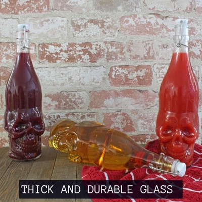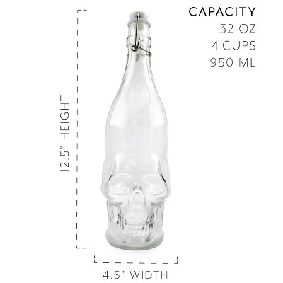 Impress your friends when you display this glass skull empty bottle for Halloween party decoration or use to serve your favorite spooky drinks. These are great for serving your favorite store-bought or homemade soft drinks or hard beverages or any beverage of your choosing. Use for DIY “potion-making” for some added Halloween fun! Great horror adornment. These bottles are very large holding 1 liter / 1 quart, ideal for centerpiece use.