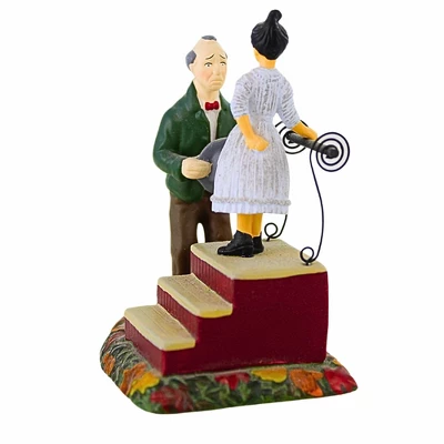 Spellbound By Hypno Girl is a quirky 3.5-inch Halloween Snow Village figurine that adds a fun and magical touch to your collection. The scene features an old man, captivated by a spellbinding woman standing on a platform, casting her hypnotic charm. Perfect for your Halloween village display, this accessory brings a playful, eerie vibe to your spooky setup. Measures Approximately 3.5 In H X 3 In W X 2.25 In D (HxWxD). Includes 1 Figurine.