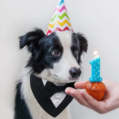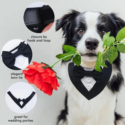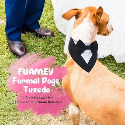 SIZE: This dog tuxedo is available in four sizes: XS,S,M,L,XL dog bow tie collar neck girth is adjustable, suitable for most dog sizes, such as: Yorkshire, Bulldog,West Highlander, Poodle,Shih Tzu, Bichon,Beagle,French Bulldog, Golden retriever, LabradorOCCASION: dog bandana is not only a dog wedding attire, but also allows the dog to attend important events such as birthdays, Valentine’s Day, cosplay, etc. It is a nice formal bandana collar for small medium large dogsPRIME MATERIAL: This dog bow tie is of excellent workmanship, made of fine suiting fabric, stylish and functional, dog bandana are durable and can be reused.Several colors to choose from, suitable for dogs with different coat colorsEASY ON:This adjustable dog collar is closed with magic tape for easy on and off.Choose the dog tux collar and your pet will transform into the most elegant prince, adding joy to festivals,Thanksgiving, Christmas Halloween formal occasionsANY TIME: dog tuxedo costume can be worn in all seasons.dog collar with bow tie can be used as an accessory to make the dog handsome.Simply wear it around your dog’s neck and it won’t cause him to resist, making it easy for him to be a charming dog