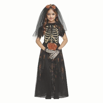 Your child can be the most elegant bride at the Halloween costume party.. Our Girl’s Bones Bride features a lovely, black, full-length gown with multi-layer skirt and a bodice with attached rib bones made of soft, pliable EVA material.. Care Instructions: Hand wash using a soft cloth or sponge with cold water and mild soap.. For best results hang or lay flat to dry..