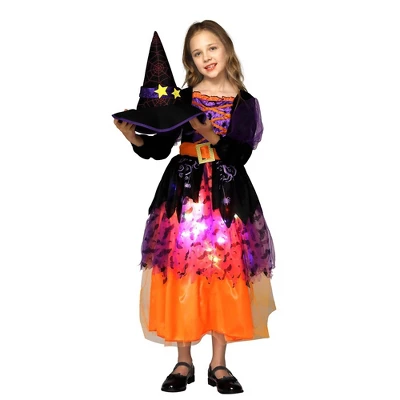 - 【Super Cute Witch Costume】Our halloween light up witch costume for girls includes 1 classic long witch hat and 1 light up dress with orange tulle layered. The witch costume include a glittery dress and a hat.Such a great holiday party costume.Nice and very elegant for a cute witch in the family(Broom doesn’t included!!!)