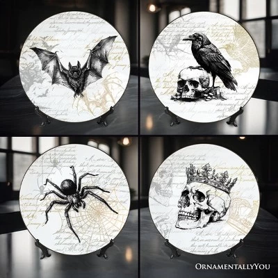 Elevate your Halloween dining experience with this exquisite set of four plates, each adorned with intricate Gothic designs and real gold trim. Perfect for adding a touch of sophistication to your table, these plates feature striking motifs of bats, skulls, spiders, and ravens, making them an ideal choice for serving salads, desserts, appetizers, and side dishes. Crafted to blend elegance with its unique charm, this collection will enhance your Halloween festivities and impress your guests.