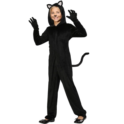 The Fun Costumes Black Cat Costume for KidsWhen the Halloween season arrives choosing the right costume is an important decision. There are few critters that are more ominous than a mysterious black cat in the moonlight of All Hallow’s Eve, so your child should become a dark ominous feline with this Black Cat Costume Jumpsuit for kids!Product Design:Turn your little on an icon of the Halloween season with this Black Cat Costume! This black velour jumpsuit has a simple and relaxed fit that will make dressing for your next costume party a breeze. Sewn to the back is a plush tail with a wire interior that allows you to pose it as you like. The hood pulls up and features black and white cat ears for the final feline touch.Product Details:100% polyester velour fabricJumpsuit has hook & loop fastener at center frontStuffed tail sewn to back of suit has wire inside for poseabilityCat ears sewn to top of hoodAbout Us:Fun Costumes are exclusively made by us and begin with passion, teamwork, and industry expertise decades in the making. Our products are proof that with the right people even a simple idea can grow into something incredible. We started in a small garage in Minnesota, providing costumes to our local community, and now we’re creating costumes for people all around the world.