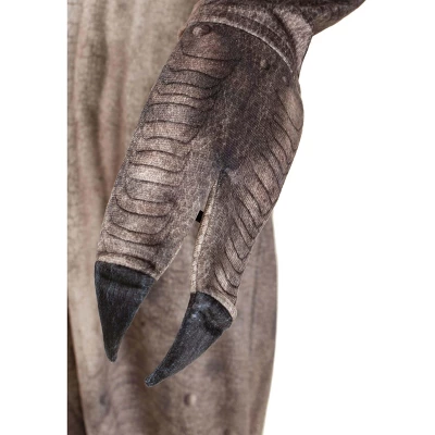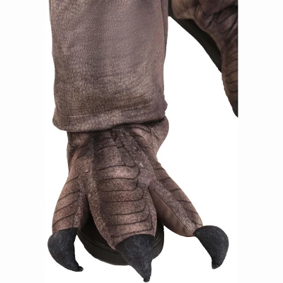 The Fun Costumes T-Rex Costume for KidsBring the fun of the Jurassic to modern days with this Realistic T-Rex costume! The costume features soft minky jumpsuit with an all-over print of dinosaur scales. The suit easily zips up the front and features a large plush pointed tail in the back. Mitts are attached at the wrist and add the effect of long dinosaur claws covering the top of the hands and they’re held in place with elastic bands. The T-Rex headpiece is where this costume really stands out! It feature fiberfill stuffing to create a plush 3D face complete with eyes and a snout. The child’s face peeks out through the jaws, which are lined with felt teeth that look quite ferocious. The hood has inner padding so it fits comfortably on the head and secures with a hook and loop fastener at the back of the neck. Matching foot covers are also included to complete the outfit.Product Details:100% polyesterMinky fabric jumpsuit has stuffed tail sewn on the backZipper down center frontMitts sewn to sleeve cuffs flip back to free handsFoam-backed hood has hook & loop fastener at back of neckHood has inner shaping & padding for positioningFiber filled foot covers have elastic bands to secure under your feet, hook and loop fastener on the sideAbout Us:Fun Costumes are exclusively made by us and begin with passion, teamwork, and industry expertise decades in the making. Our products are proof that with the right people even a simple idea can grow into something incredible. We started in a small garage in Minnesota, providing costumes to our local community, and now we’re creating costumes for people all around the world.