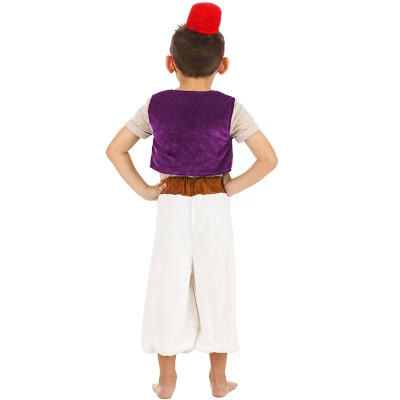 Disney Aladdin Costume for Toddler Boys: Kids can be rather charming, just like Disney’s Aladdin! Some love adventure and love going for that apple snuck right before meals. Then again, a heart of gold may lead them to share those treasured treats. If that sounds like your little one, get them dressed as the character they were born to play in our exclusive Disney Aladdin Toddler Costume! This licensed ensemble comprises four thoughtfully crafted pieces. A lightweight knit shirt with a notched collar and cuffed sleeves starts the look. A purple velour vest layers overtop. Included pants made of white fleece and featuring an elastic waistband ensure full-coverage comfort. A red velvet fez completes the look.Product Details:Crafted from a mix of polyester, cotton jersey knit, and velour, this costume brings Aladdin’s signature look to life in toddler sizeThe shirt showcases a stylish V-placket at the front, paired with a secure hook & loop fastener at the back, ensuring a comfortable fit for your little oneComplementing the shirt, the purple velour vest radiates royal vibes and boasts a full satin lining for added comfortFor easy movement and play, the pants are designed in soft fleece, accentuated by a faux suede waistband that features elastic at the backDesigned for a snug fit, the pants cuffs come with elastic and stop stylishly at mid-calfA charming touch is added with an appliqued patch and decorative stitching on the lower right leg of the pantsThe foam-backed velour fez hat, iconic to Aladdin’s look, is topped off with a stretchy chin strap for secure wearEnsuring the hat stays in place, the elastic chin strap easily attaches at its ends with a hook & loop fastenerOur officially licensed Aladdin Toddler Costume is ready to help your little one have amazing Aladdin adventures. About Us:Fun Costumes are exclusively made by us and begin with passion, teamwork, and industry expertise – proof that with the right people even a simple idea can grow into something incredible. We started in a small garage in Minnesota, and now we’re creating costumes for people all around the world.