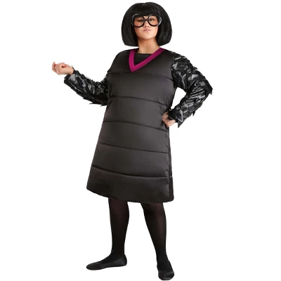 Darling, We Need to Talk Fashion! Supermodels? Heh! Nothing super about them. But YOU? You are a superhero – and that means you need a look worthy of your powers! With my Plus Size Edna Mode Costume, you won’t just wear fashion – you’ll become it. This isn’t just any costume, darling; it’s my masterpiece! Superpowers are optional, but style is mandatory! Don’t worry, I have personally taken care of every detail, so you can be the epitome of chic, just like Edna herself. Just remember – NO CAPES!Sophisticated Style Never Looks Back, Darling.It distracts from the now. And with The Inredibles Edna Mode Plus Size Costume, you will own the now! The black satin dress has been crafted with a quilted stitch design, giving it that bold, puffer look that just screams superhero fashion designer chic. The 3D vinyl-layered jersey-knit sleeves bring the perfect touch of avant-garde, while the purple satin collar provides just the right pop of color to balance the entire look. The hook-and-loop closure makes sure you can slip into your fashion-forward new persona with ease, so you can focus on what really matters—looking fabulous! I’m far too busy for mistakes, darling, so I’ve made this foolproof. Just put it on and prepare to dazzle.Finish With a Flourish, Darling! The Women’s Plus Size Edna Mode Costume would not be complete without my signature finishing touches. The costume comes with a sleek, black bob-cut wig – just like mine, naturally – secured with a mesh cap and elastic band so it stays flawless through all your superhero antics. And those glasses? Darling, they are iconic! The plastic round frames with large lenses are the mark of a true design genius (moi!), and when you wear them, everyone will know that you mean business. Slip them on and embrace your inner Edna Mode – because, darling, you are the greatest good you will ever have! – Dress – Glasses – Wig