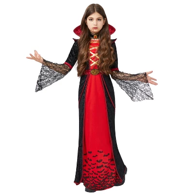 “From Trick-or-Treating to Transylvanian Royalty!”This luxe vampire costume transforms girls into mistresses of the night with:• Oversized bell sleeves perfect for dramatic “bat wing” poses• Attached corset lacing for a regal silhouette• Matching choker to complete the haunting lookWhy Parents Love It:✅ Photo-Ready – Pair with fake blood jewelry and pale makeup for Instagram-worthy shots.✅ Group Costume Potential – Coordinate with little brothers as Dracula or friends as vampire brides.✅ Beyond Halloween – Great for Renaissance fairs or theater performances.🎃 Perfect For:• Halloween haunted houses• “Twilight” or “Hotel Transylvania” parties• Gothic birthday photoshoots• School vampire-themed dances