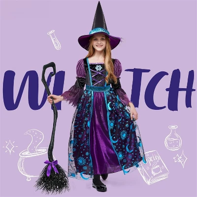 - 🎃Transform into a mystical witch with our moon shimmer witch costume! This enchanting set includes a dress, a belt adorned with a bow tie, a hat, and a broom with 5 ribbons, providing everything you need for a captivating look.
