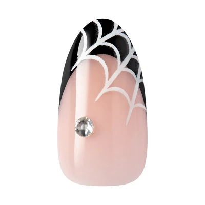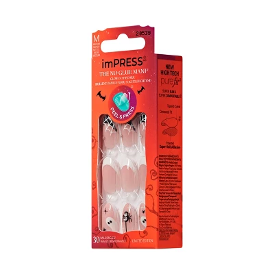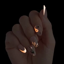 Medium white almond nails glow in the dark with a glossy, spooky finish. The ‘Drop-Dead Gorg’ design creates a quick, no glue Halloween mani with ghostly shine, spooky details, and hauntingly polished charm. No glue. No damage. No stress. Just flawless, salon-worthy nails in minutes! Safe on natural nails, and wickedly easy to apply—just peel, press and haunt. Perfect for a hauntingly glam Halloween look.