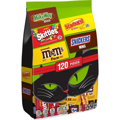 - Contains one (1) 47.23-ounce, 120-count bulk variety bag filled with M&M’S Peanut, SNICKERS, SKITTLES Original, STARBURST Original & MILKY WAY Fun Size and Minis Halloween Candy