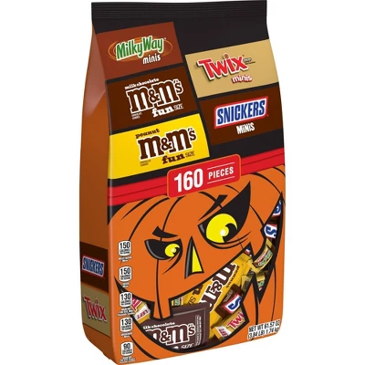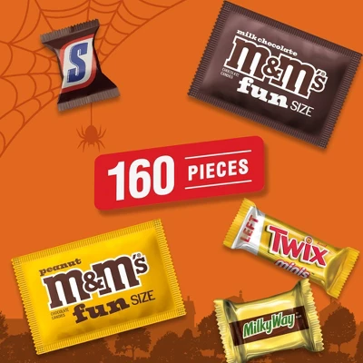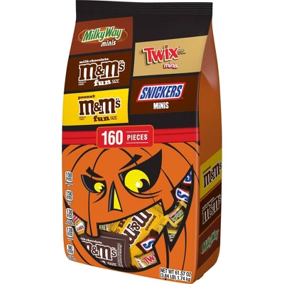 As the doorbell rings and ghouls and goblins appear, celebrate Treat Season with this wickedly delicious assortment. This bewitching blend of fun size and mini bulk Halloween candy bag, features 160 pieces of M&M’S Milk Chocolate, M&M’S Peanut, SNICKERS, TWIX, and MILKY WAY Halloween chocolates.