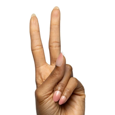 - A minimalist neutral blush pink gradient manicure in a short almond shape.