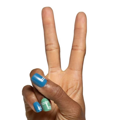 - A fresh blue and green mixed mani with accented with sporty stripes extra short squoval shape