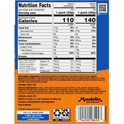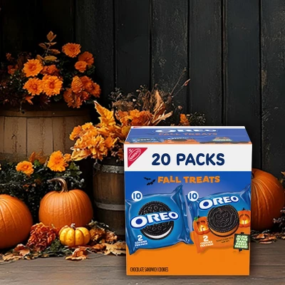 - One 20-count OREO Boo! Fall Treats Trick or Treat Halloween Cookies Variety Pack with 10 two-cookie snack packs of original OREO chocolate sandwich cookies & 10 two-cookie snack packs of OREO Halloween Cookies