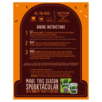 Easily prepare a delicious dessert with Pillsbury Halloween Funfetti Cake Mix with Candy Bits. This Pillsbury cake mix delivers delicious cake with a moist texture, festive orange and black Halloween candy bits and easy-to-follow instructions. The Funfetti cake mix contains all the dry ingredients you need to create delicious desserts at home in just three steps. Simply add water, vegetable oil and eggs to the dry baking mix, and stir to combine. After mixing the ingredients, bake your cake according to the time given on the box. This boxed cake mix makes enough batter for a 13 by 9 inch cake, two 8 inch round cakes or a standard Bundt cake. It can also be used as a cupcake mix to make up to 24 cupcakes. Decorate the cooled cake with Pillsbury Funfetti frosting or make your own cake creations like cake pops or a trifle for an extra special Halloween treat. Pillsbury Halloween Funfetti Cake Mix with Candy Bits is great for Halloween cupcakes and other Halloween treats. The dessert mix comes in a 15.25 oz box that is easy to store in the pantry for a ready to prepare cake. Our cakes will take your next party or get-together to the next level. The Pillsbury Baking website has delicious and easy recipes, fun ideas and simple Halloween baking tips to help you and your family create tasty memories together.