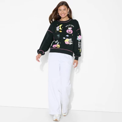 Step out in comfort with the Women’s Hello Kitty Halloween Graphic Sweatshirt in Black. Featuring a festive Hello Kitty design with glow-in-the-dark details, this sweatshirt brings playful Halloween vibes with just the right touch of charm. Made from soft, midweight fleece, it keeps you cozy on chilly fall nights, making it perfect for pumpkin carving, haunted movie marathons or trick-or-treating in style. The regular fit, round neckline and at-waist length make it a comfy, easy-to-layer favorite you’ll want to wear all season long.