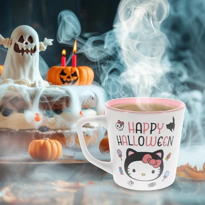 - TRENDY DRINKWARE: Fun Sanrio themed mug featuring Hello Kitty dressed up like a black cat with the text “Happy Halloween”.