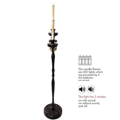 - The candle flames are LED lights which are powered by 4 AA batteries. (not included). The light has 3 modes; on with sound, on without sound, and off.
