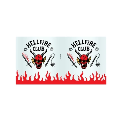 Turn your world upside down with this officially licensed Stranger Things Season 4 drinkware! Your favorite 1980s-inspired Netflix television series is taking you back to Hawkins, Indiana to fight the evil creature, Vecna, who is terrorizing Max and other traumatized members of the town! Blast your favorite song and take this awesome cup to fight the curse of Vecna today. This 16 oz cup features the Hellfire Club logo and a demon with a sword and mace next to him.