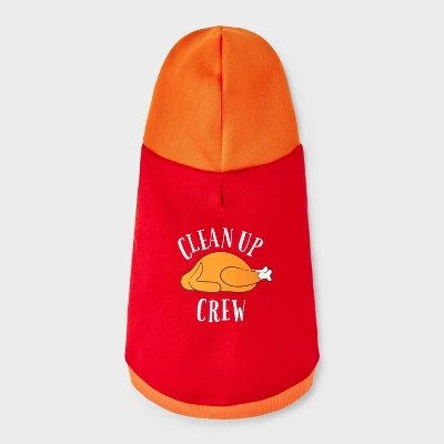 Call in the cutest clean-up crew ever with your pet dressed in this Thanksgiving Turkey Dog and Cat Hoodie Full Body Costume from Boots & Barkley™. Made from polyester, this red and orange dog and cat costume features a hood, “Clean Up Crew” text, and a cooked turkey graphic for a hilarious touch. The costume stays secure with a hook-and-loop strap closure and is hand-washable for easy cleaning.