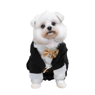 Item Function: 1. Choose a size of dog tuxedo based on chests, back length, and neck circumference for optimal fit. Refer to the size chart before purchase. 2. This dog suit has an exquisite shirt collar, charming gentleman, and Western fashion style for a stunning look on special days! 3. This dog wedding outfit is made of durable polyester fabric, breathable, soft, and professionally crafted for the pet’s comfort. Your pet will love these dog shirts! 4. White button closure for easy dressing. This dog tuxedo for small dogs is machine washable or hand wash in cold water for convenience. 5. This tuxedo for dogs is suitable for special events and weekend parties like weddings, birthdays, Christmas, New Year’s Eve, Valentine’s Day, formal occasions, and Halloween.Specifications:Color: Black; Material: Polyester; Package List: 1 Pc Dog Tuxedo.